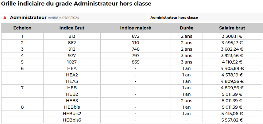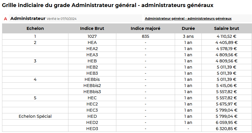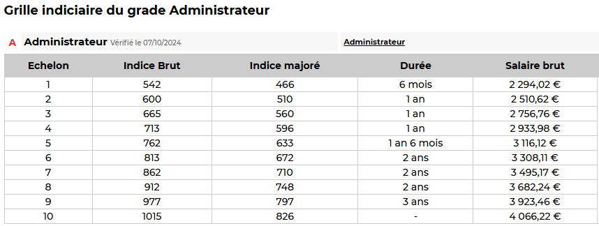Cette grille indiciaire Administrateur Territorial décrit la rémunération brute mensuelle, elle ne tient pas compte des éventuelles bonifications indiciaires, primes et les indemnités (supplément familial de traitement, indemnités de résidence, Rifseep, etc …).