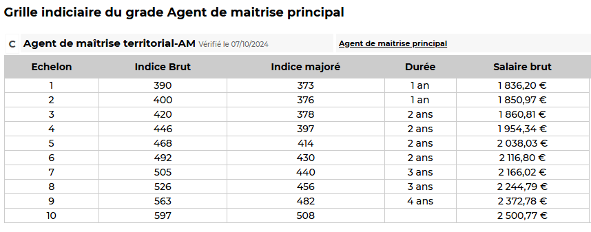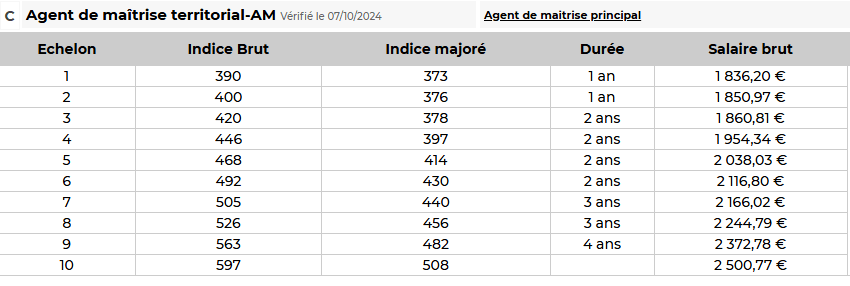 Cette grille indiciaire Agent de Maîtrise territorial décrit la rémunération brute mensuelle , elle ne tient pas compte des éventuelles bonifications indiciaires, primes et les indemnités (supplément familial de traitement, indemnités de résidence, Rifseep, etc …).