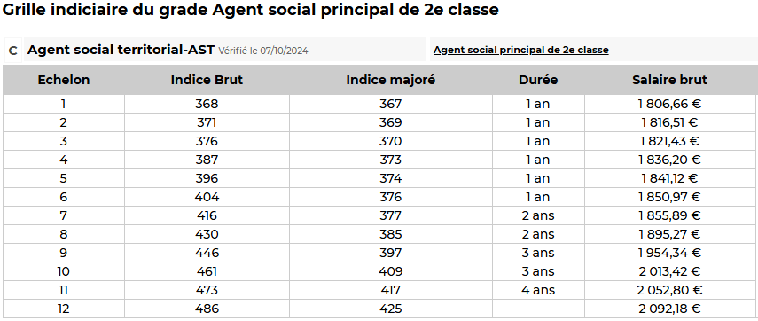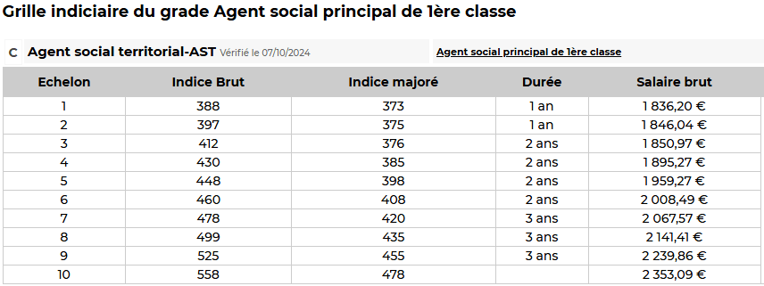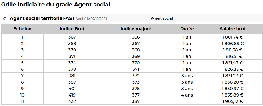 Cette grille indiciaire Agent social Territoriale décrit la rémunération brute mensuelle , elle ne tient pas compte des éventuelles bonifications indiciaires, primes et les indemnités (supplément familial de traitement, indemnités de résidence, Rifseep, etc …).