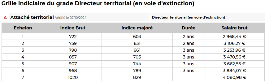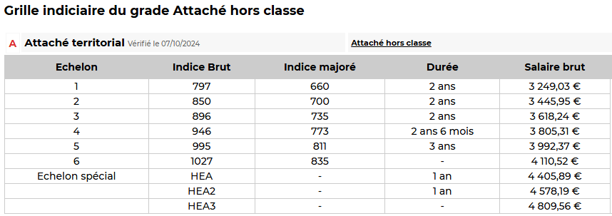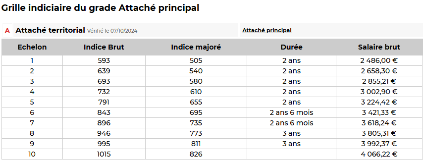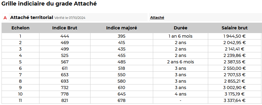 Cette grille indiciaire Attaché Territorial décrit la rémunération brute mensuelle, elle ne tient pas compte des éventuelles bonifications indiciaires, primes et les indemnités (supplément familial de traitement, indemnités de résidence, Rifseep, etc …).