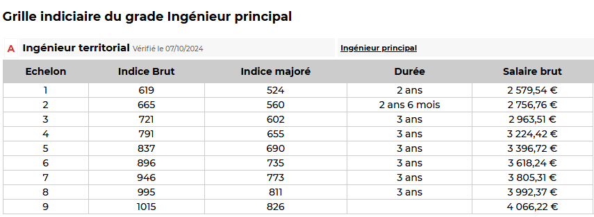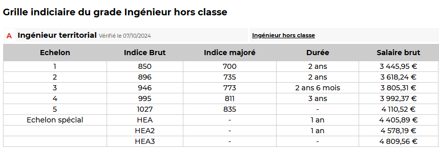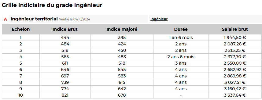 Cette grille indiciaire Ingénieur territorial décrit la rémunération brute mensuelle , elle ne tient pas compte des éventuelles bonifications indiciaires, primes et les indemnités (supplément familial de traitement, indemnités de résidence, Rifseep, etc …).